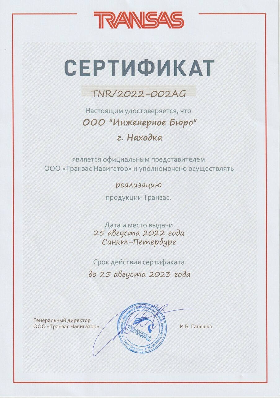 Начиная с 25.08.22 г. до 25.08.23 г. компания "Инженерное бюро" является официальным представителем ООО "Транзас Навигатор" и уполномочена осуществлять реализацию продукции Транзас.