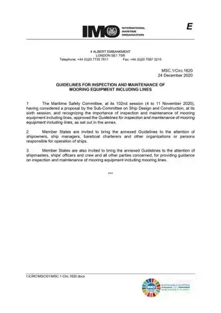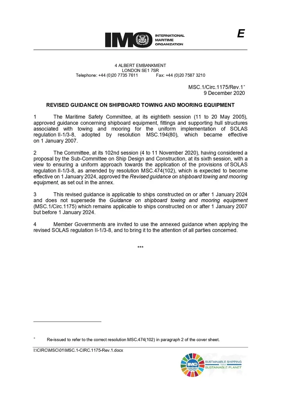 С 1 января 2024 года в соответствии с правилом II-1/3-8.9 СОЛАС-74 с поправками, внесенными резолюцией ИМО MSC.474(102) от 11 ноября 2024 года, на всех судах построенных до, в или после 1 января 2009 года швартовное оборудование, включая тросы, должно проверяться и обслуживаться в состоянии, пригодном для использования по прямому назначению, в соответствии с циркуляром ИМО MSC.1/Circ.1620. В приложении к циркуляру MSC.1/Circ.1619 содержится Руководство по проектированию швартовых устройств и выбору соответствующего швартового оборудования и средств для безопасной швартовки. При этом с 09 декабря 2020 года действует пересмотренное Руководство по судовому буксирному и швартовному оборудованию утвержденное MSC.1/Circ.1175/Rev.1. Настоящее пересмотренное руководство применимо к судам, построенным 1 января 2024 года или после этой даты, содержит и не заменяет собой Руководство по судовому буксирному и швартовному оборудованию (MSC.1/ Circ.1175), которое остается применимым к судам, построенным 1 января 2007 г. или после этой даты, но до 1 января 2024 г.