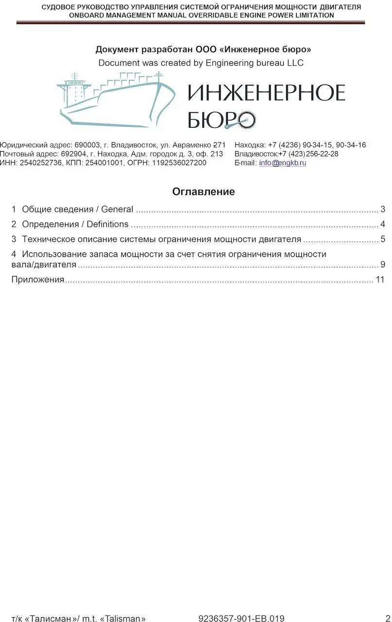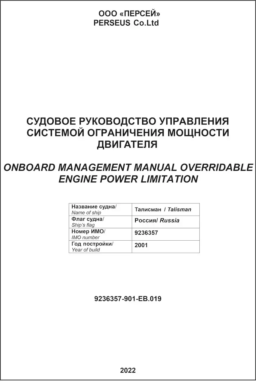 Данное "Судовое руководство управления системой ограничения мощности двигателя" разработано для указанного судна согласно Правилу 5.4 Приложения VI МАРПОЛ. Руководство подготовлено на основании Резолюции MEPC.335(76) «2021 GUIDELINES ON THE SHAFT / ENGINE POWER LIMITATION SYSTEM TO COMPLY WITH THE EEXI REQUIREMENTS AND USE OF A POWER RESERVE».